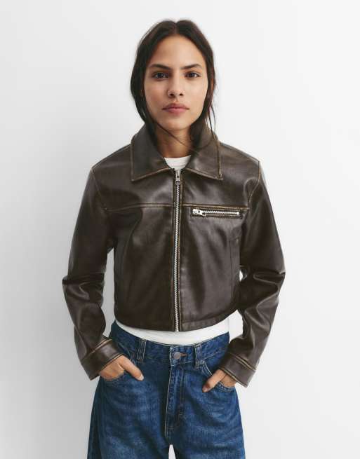 Pull&Bear - Giacca in pelle sintetica marrone slavato