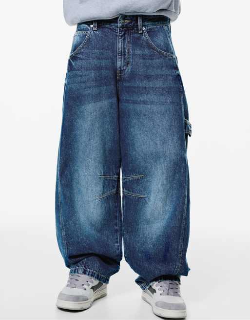 Pull&Bear - Jeans a palloncino color blu medio con tasca ricamata
