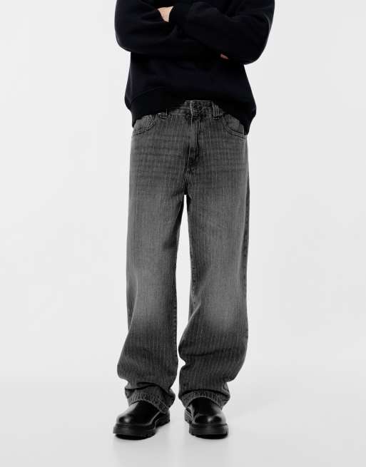 Pull&Bear - Jeans con fondo ampio nero sbiadito con stampa laser