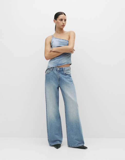 Pull&Bear - Jeans dritti a vita medio alta color blu pallido con strass