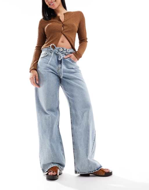 Pull&Bear - Jeans larghi blu allacciati in vita