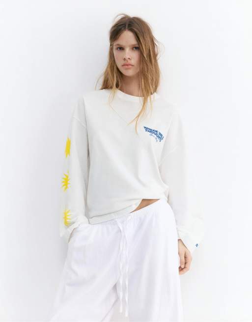 Pull&Bear - Maglietta a maniche lunghe color ghiaccio con stampa di sole