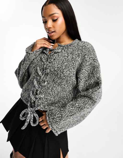 Pull&Bear - Maglione corto grigio scuro sale e pepe con lacci sul davanti