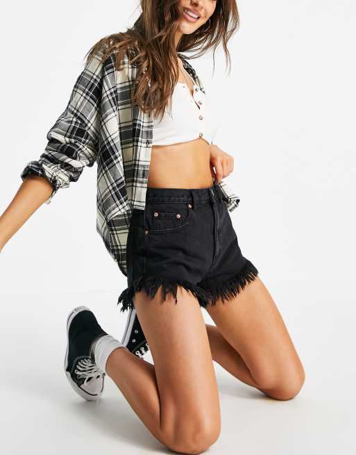 Pull&Bear - Pantaloncini di jeans neri con orlo sfrangiato