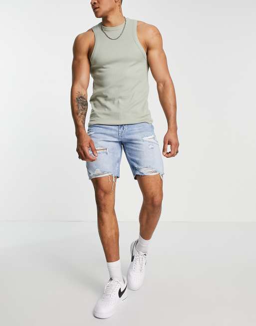 Pull&Bear - Pantaloncini dritti in denim blu medio con strappi