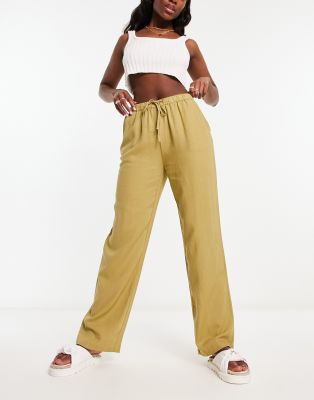 Pull&Bear - Pantaloni in lino kaki a vita alta