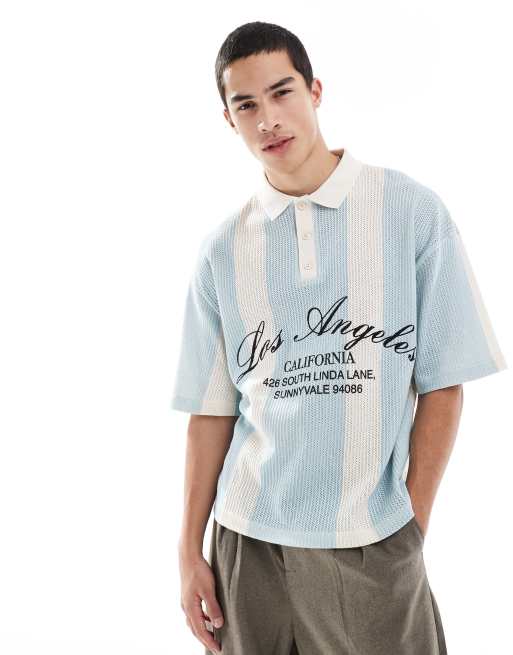 Pull&Bear - Polo rétro in maglia blu a righe larghe