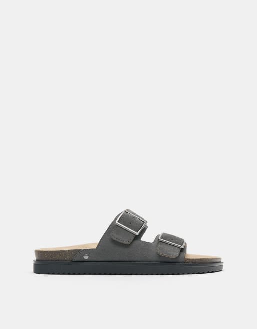 Pull&Bear - Sandali bassi in pelle grigi con fibbia