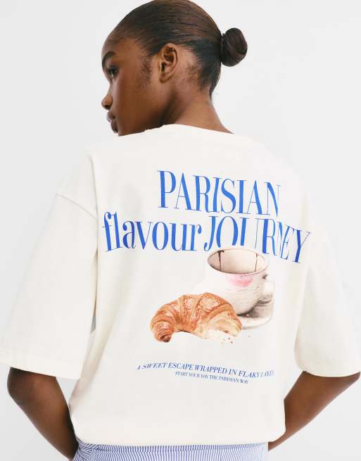 Pull&Bear - T-shirt beige con stampa di croissant e caffè