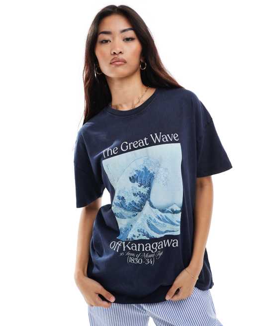 Pull&Bear - T-shirt blu navy con stampa della grande onda