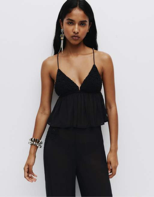 Pull&Bear - Top all'uncinetto nero con spalline sottili