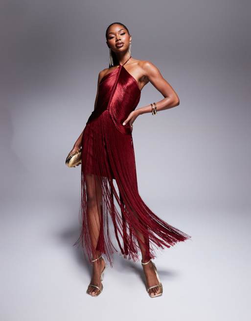 Rare London - Vestito corto rosso allacciato al collo con frange