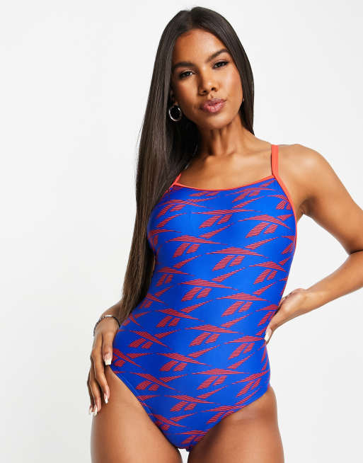 Reebok - Costume da bagno blu con stampa rossa