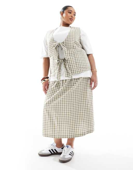 Esclusiva Renée Studio - Coordinato verde a quadretti con gonna lunga e gilet double-face allacciato sul davanti