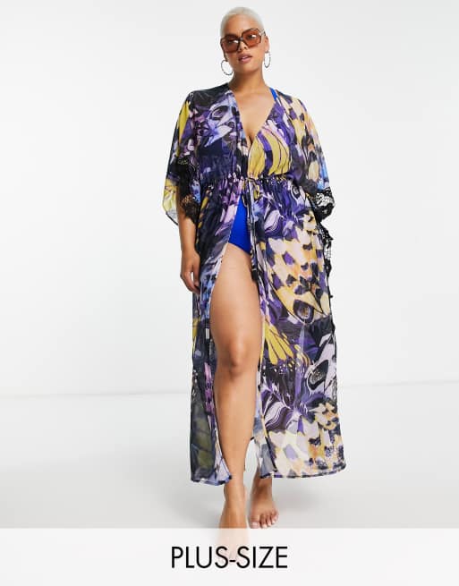 River Island Plus - Caftano lungo viola con maniche a palloncino