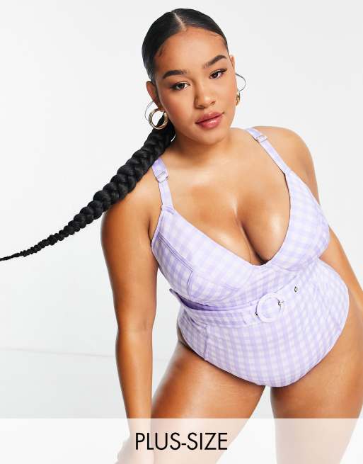 River Island Plus - Costume da bagno viola a quadretti con fibbia testurizzata