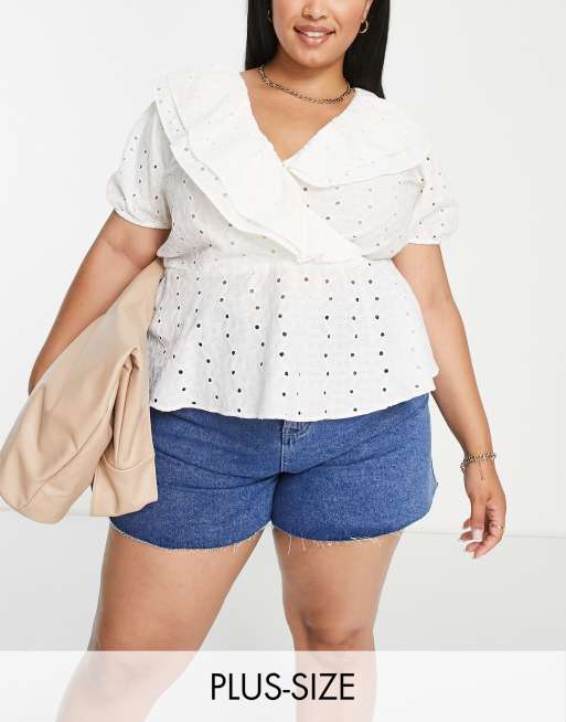 River Island Plus - Top in pizzo sangallo bianco con volant
