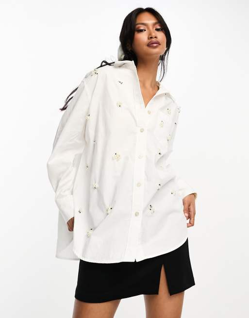 River Island - Camicia oversize bianca con decorazione di perle