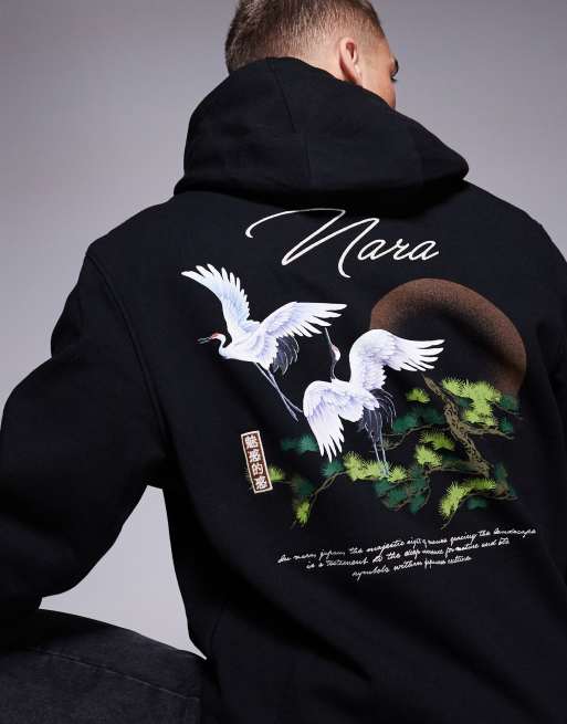 River Island - Felpa nera con cappuccio e stampa di gru sulla schiena