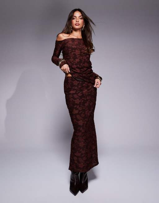 River Island - Gonna midi in tessuto dévoré marrone a fiori in coordinato