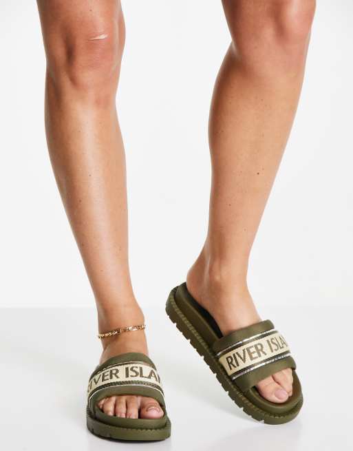River Island - Sandali slider kaki con nastro con logo e suola spessa