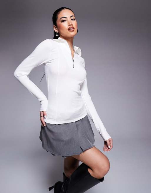 River Island - Top a maniche lunghe bianco a coste con zip sul davanti