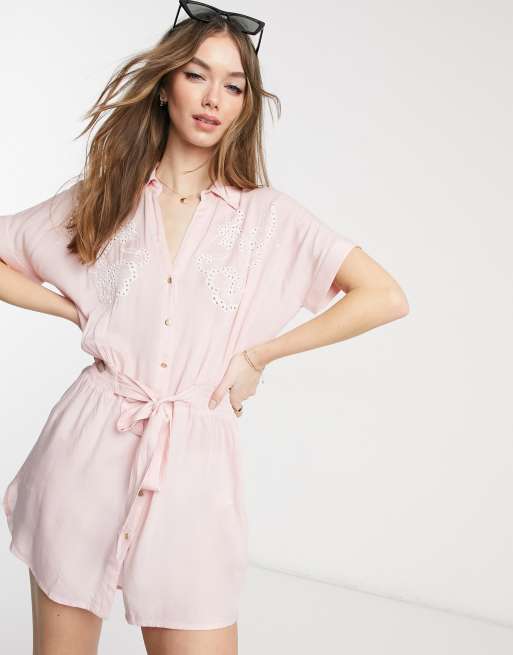 River Island - Vestito camicia corto da mare in pizzo sangallo rosa