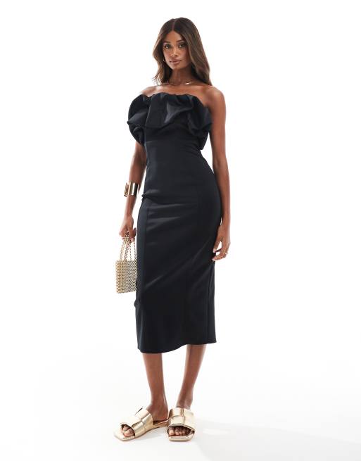 River Island - Vestito midi nero con maniche a sbuffo e scollo Bardot