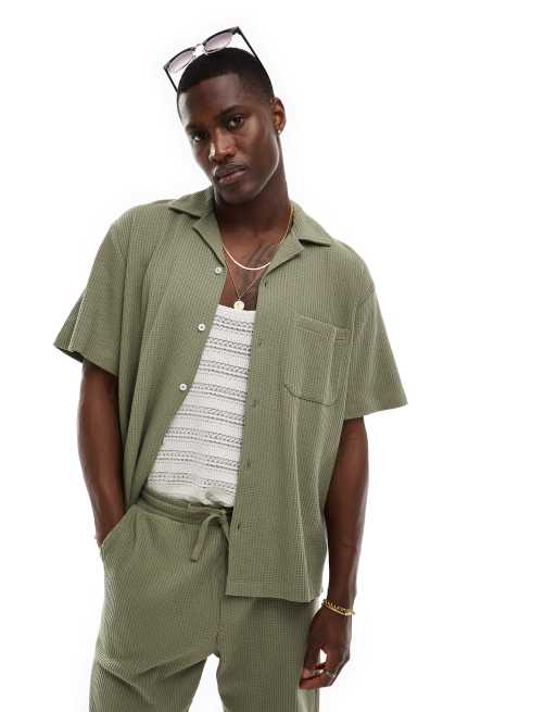 Selected - Camicia kaki squadrata lavorata a nido d'ape con rever in coordinato