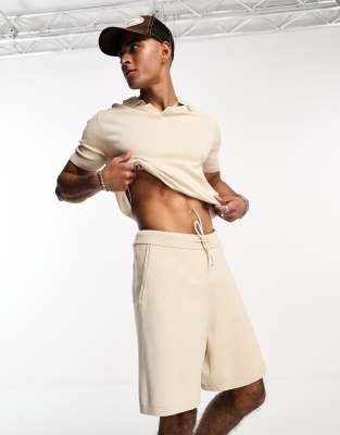 Selected Homme - Pantaloncini in maglia beige con coulisse in vita in coordinato