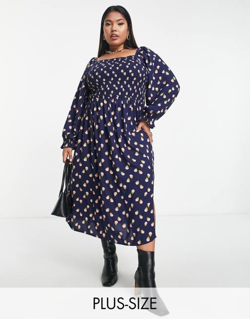 Simply Be - Vestito midi arricciato con scollo squadrato blu navy a fiori con spacco laterale