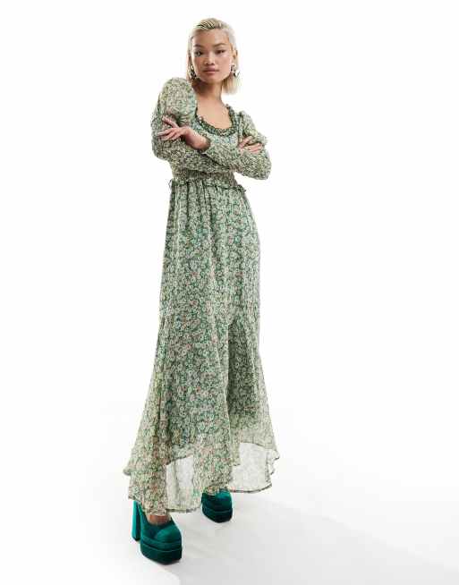 Sister Jane - Vestito al polpaccio verde a fiori con bustino arricciato e allacciatura sulla schiena