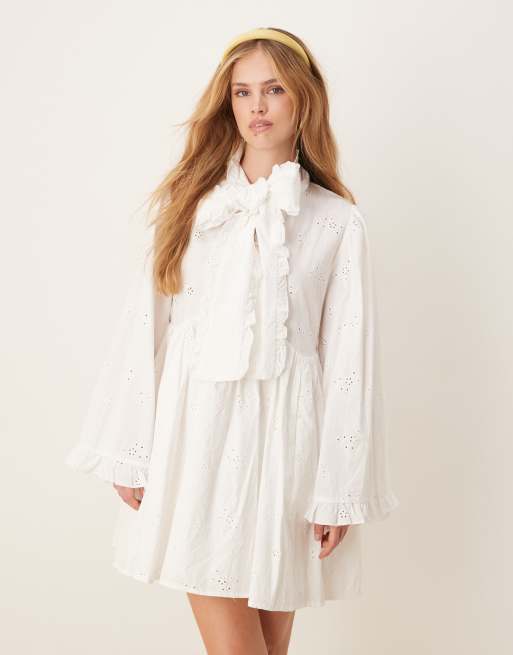 Sister Jane x ASOS - Meadow - Vestito corto in pizzo sangallo bianco con fiocco