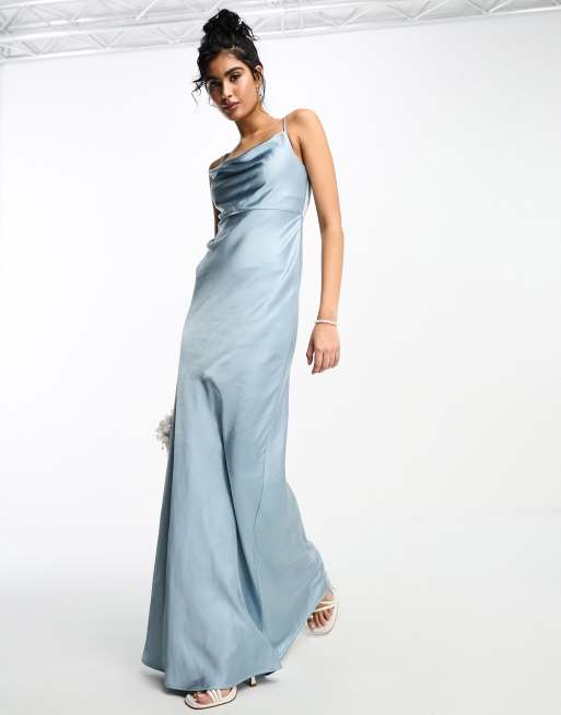 Six Stories - Vestito sottoveste da damigella in raso blu polvere con scollo ad anello sul davanti