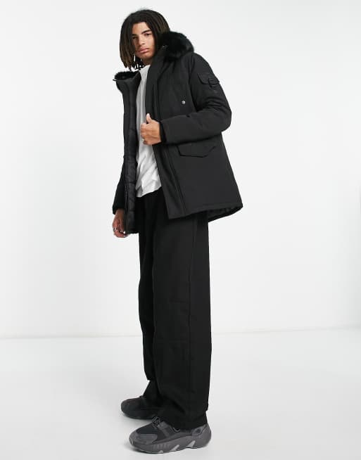 Sixth June - Parka nero con cappuccio con pelliccia sintetica e fibbia