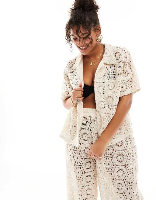 South Beach Curve - Camicia da spiaggia crema all'uncinetto in coordinato