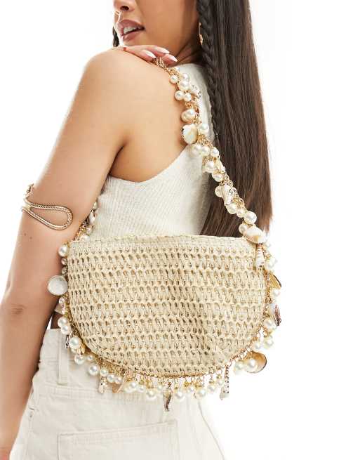 South Beach - Borsa da spalla all'uncinetto decorata con perle e conchiglie