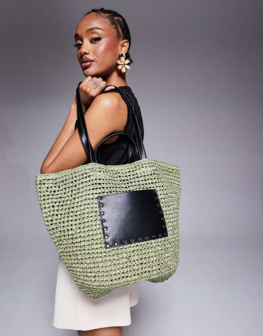 South Beach - Borsa shopping da spalla in paglia verde oliva con pannello in pelle sintetica