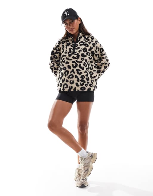 South Beach - Felpa in pile borg con stampa leopardata e zip corta