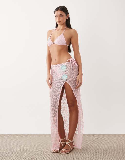 South Beach - Gonna lunga rosa confetto con paillettes e conchiglie applicate