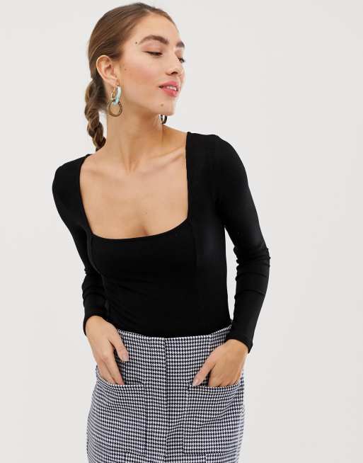 Stradivarius - Body nero a coste con scollo squadrato