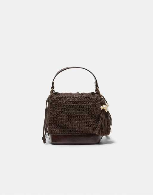 Stradivarius - Borsa a secchiello combinata all'uncinetto marrone