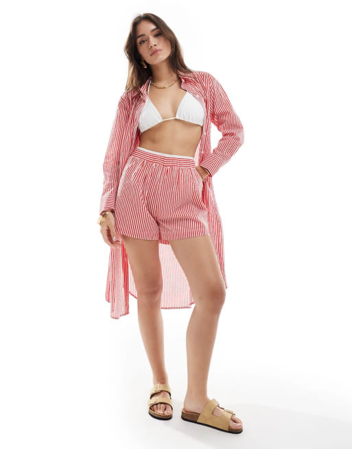 Stradivarius - Coordinato da spiaggia taglio lungo con camicia e pantaloncini rosso a righe