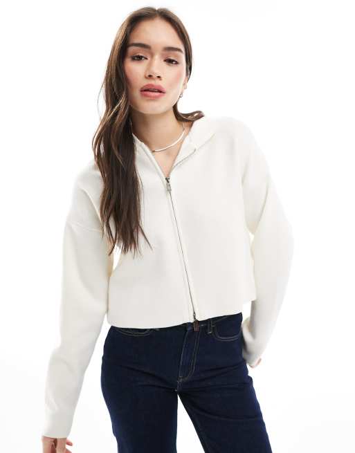 Stradivarius - Felpa con cappuccio écru in maglia con zip