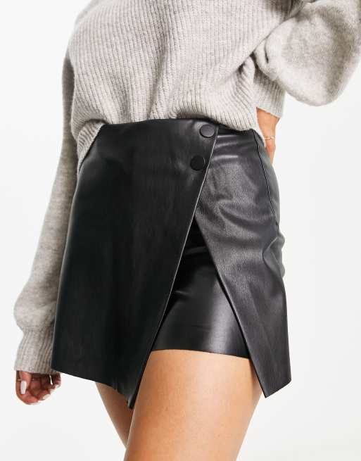 Stradivarius - Gonna pantalone avvolgente in pelle sintetica nera
