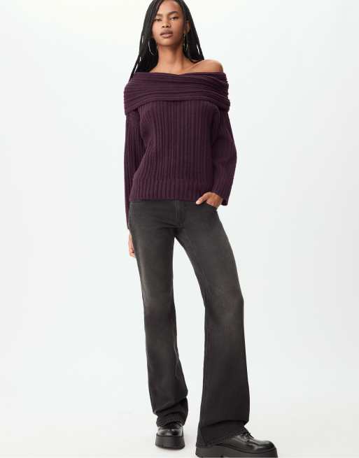 Stradivarius - Maglione in maglia bordeaux asimmetrico con spalle scoperte