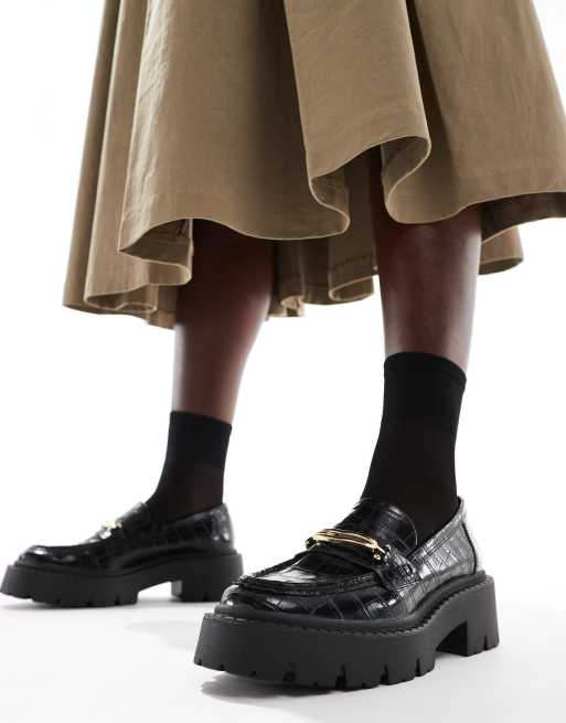 Stradivarius - Mocassini neri effetto coccodrillo con suola spessa