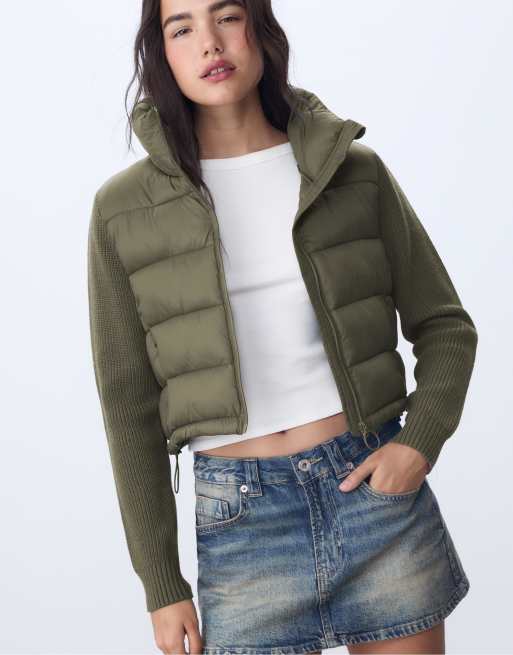 Stradivarius - Piumino kaki con maniche in maglia spessa