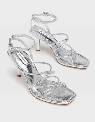 Stradivarius - Sandali con tacco e listini argento con punta quadrata