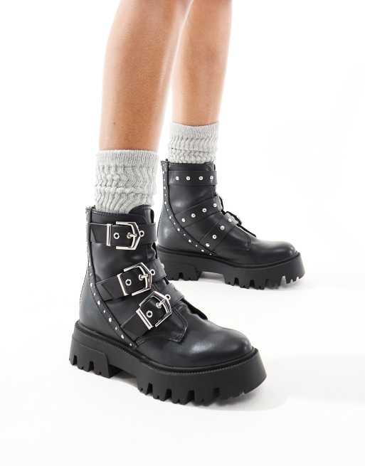 Stradivarius - Stivali bassi neri con suola spessa e fibbie